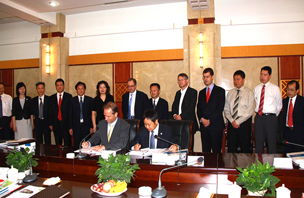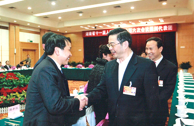 湖南省副省長張劍飛,中國航天科工集團公司黨組書記、董事長高紅衛共同為“航天凱天環??萍脊煞萦邢薰尽苯遗?。